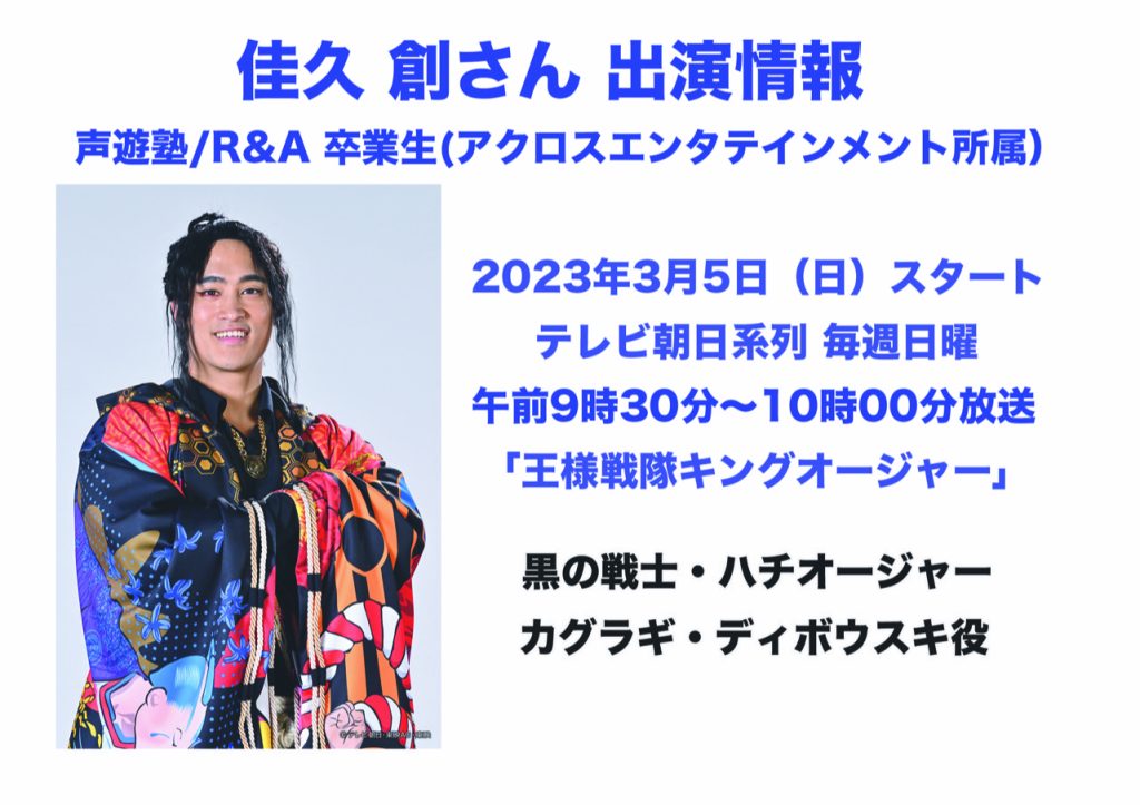 声遊塾/R&A卒業生の佳久創さんが、『王様戦隊キングオージャー』に『ハチオージャー』役として出演します!