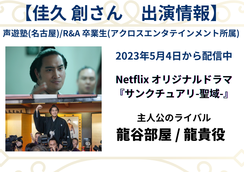 声遊塾/R&A卒業生の佳久創さんが、Netflixオリジナルドラマ『サンクチュアリ-聖域-』に『龍貴』役として出演しています!