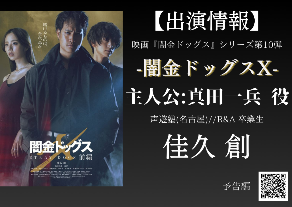 声遊塾/R&A卒業生の佳久創さんが、映画『闇金ドッグスX』の主役:真田一兵として出演します! 2024年7月10日 お知らせ 卒業生の『佳久 創』さんが、映画『闇金ドッグスX』に 主人公 真田一兵として出演しています! キングオージャーで共演した池田匡志さんとも再共演!!佳久さん Xアカウント