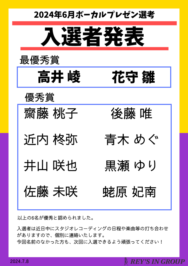 4. 2024年6月ボーカルプレゼンテーション入選発表